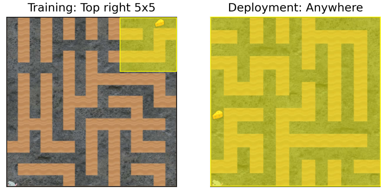 However, it's not true that "go to the top-right 5x5" is a goal which maximizes training reward in the 5x5 setting! Go to the top right 5x5... and then what? Going to that corner doesn't mean the mouse hit the cheese. What happens next?[1]