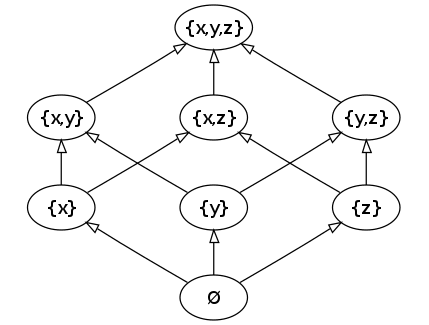 Some more math notes: A partial order is a comparison relationship between elements of a set, that doesn't require every set to be comparable. The subset relationship defines a partial order between subsets of the same set. {x} is a subset of {x, y}, so information flows from {x} to {x, y}. But neither {x, y} or {y, z} are subsets of each other, so there is not necessarily any information flow between {x, y} and {y, z}. (They share the member y, who might facilitate information flow anyway if it's just x and z that lack logical line-of-sight to each other. But that information flow doesn't come from the subset relationship and might not happen at all.)