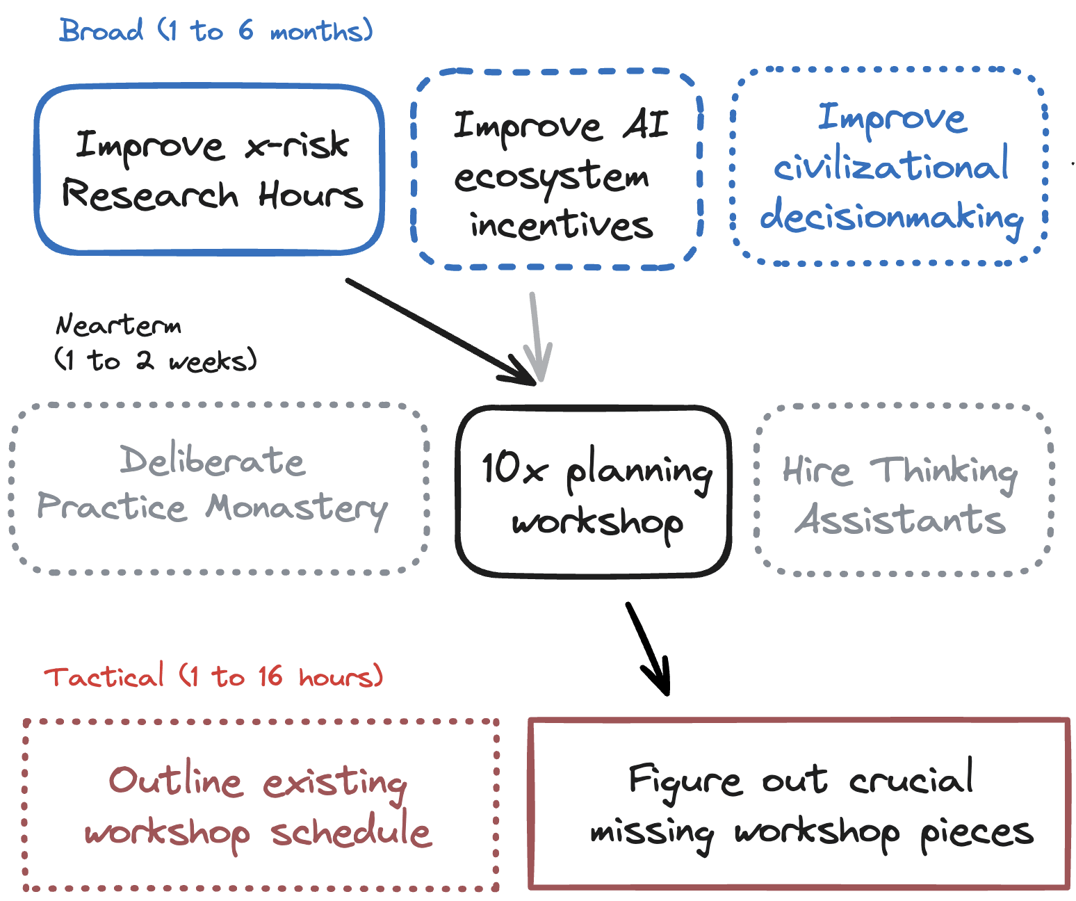 I'm hoping to go into more detail in the examples for the "Having 2+ plans at 3 levels of meta" post. But, when I was generating visions, it mostly wasn't at the "workshop" level. Here's what actually happened: