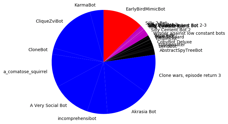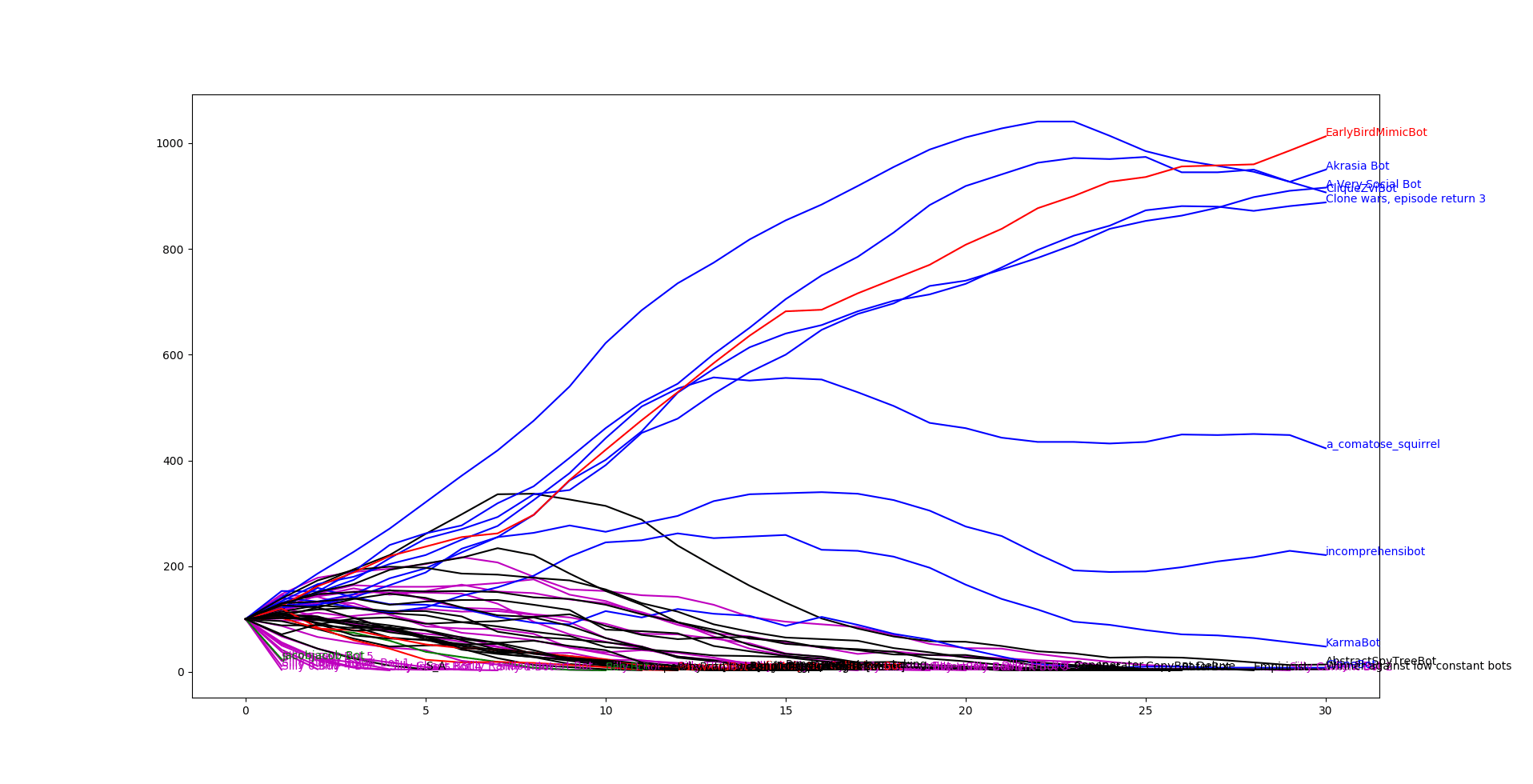 CliqueZviBotis outperforming the otherCloneBots. This is due to how theCloneBotcode interacts with the bugs in the my engine.The