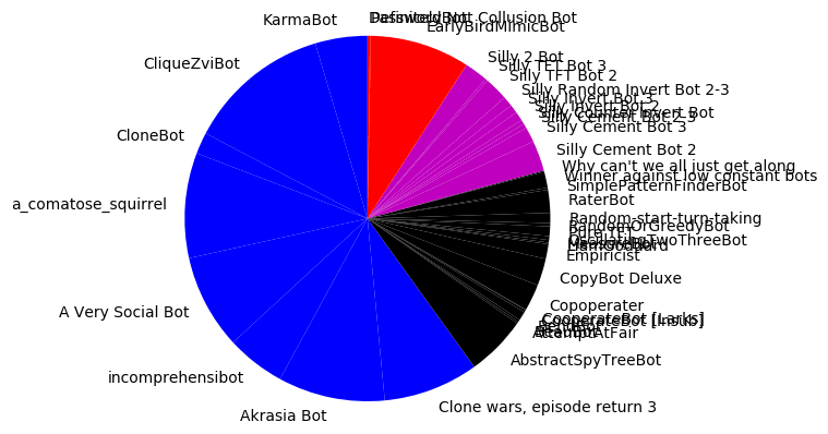 32or3on the first turn. Otherwise, returns5 - opponent_first_move.int(5 - opponent_avg). Otherwise randomly selects3or2randomly.2. Then always returns5 - opponent_previous_move3and2, starting with3.movemethod and return0. This succeeded against AbstractSpyTreeBot and failed on EarlyBirdMimicBot. Otherwise, it uses a hand-coded decision tree with 20 terminal leaves.3or2randomly until symmetry is broken. Then oscillates between2and3.2or3. Then always returns5 -opponent_previous_move.3 2 3 2. Then picks one of 5 strategies to use for the rest of the game.2or3. Then always returns5 -opponent_previous_move. (Same as Silly Counter Invert Bot.)3. Then always returns5 - opponent_previous_move3on the first turn. Otherwise, returns5 - opponent_first_move.2.2.2or3based off of round number.3s,2s,return 3s andreturn 2instances in its source code. Then picks a strategy based off of that.2on the first turn. Otherwise, returns5 - opponent_first_move.The mutant game will continue on November 27, 2020.