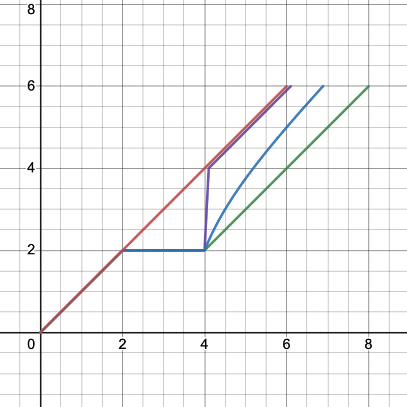 The x-axis is time; the y-axis can be size of the largest training run or capabilities. Red is default (no pause), purple is pause with near-full overhang, green is pause with no overhang, and blue is pause with some overhang. Whether the effect of a pause/slowing is closer to purple or green depends on uncertainties about the world and details of the pause/slowing.