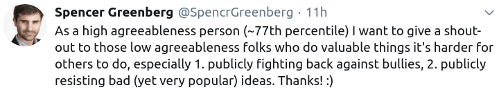With amiability there is an additional challenge: it can be difficult to get good feedback. Let’s say you find yourself at a bus stop with some random stranger, and you think—“aha! I have an opportunity to practice my amiability.” You notice they are wearing an unusually interesting sweater, and decide to compliment them on it as an opening conversational gambit.