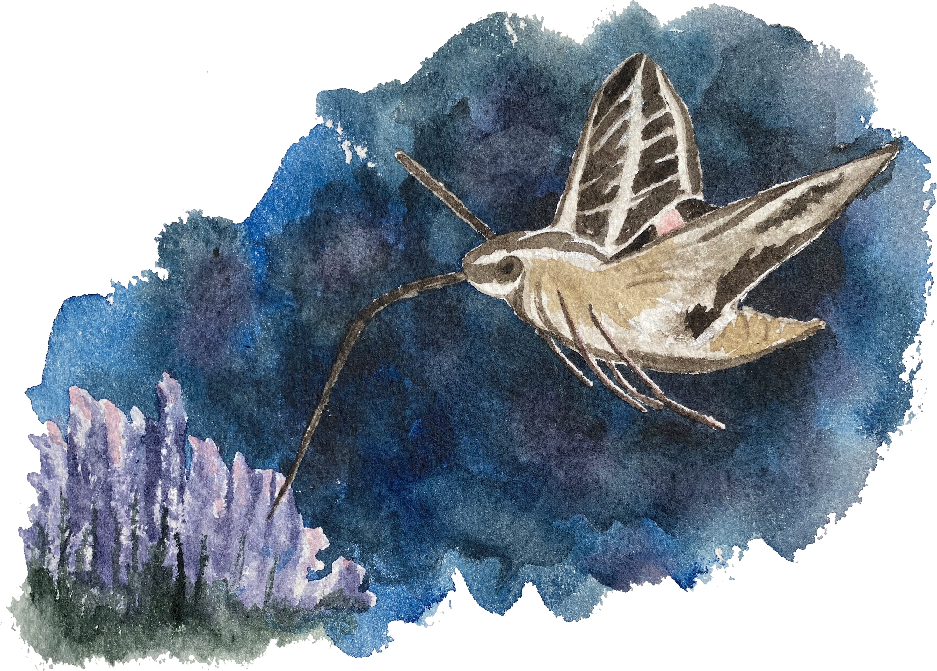 Members of this particular species can be either nocturnal or diurnal. I noticed my confusion when I saw one pollinating a lilac in bright moonlight, because I'd never seen a hummingbird at night before. That's what prompted me to take a closer look; up close it was clearly not a bird at all, but a bug!