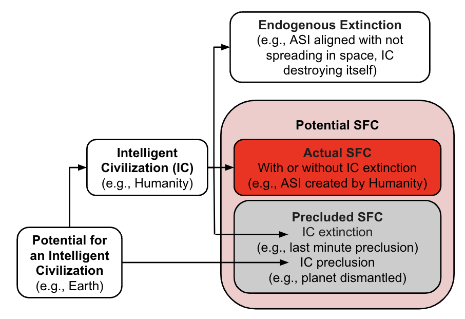 Potential SFCs do not include Intelligent Civilizations (IC) that had the potential to become SFCs but disappeared endogenously (e.g., extinction caused by bioweapons, choosing not to spread in space).