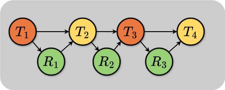 Each node along the top row is the temperature at successive times. Each node along the bottom row is the controller state at different times.