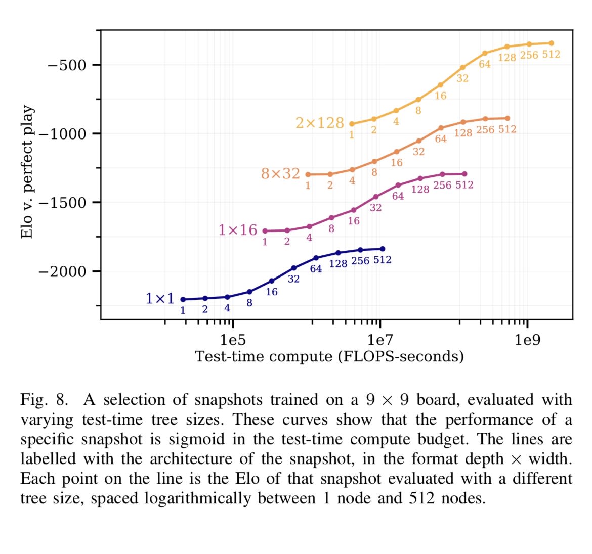 But anyway yes I think you got my point: the Jones chart illustrates (what I understood to be) gwern’s view that adding more inference/search does juice your performance to some degree, but then those gains taper off. To get to the next higher sigmoid-like curve in the Jones figure, you need to up your parameter count; and then to climb that new sigmoid, you need more search. What Jones didn’t suggest (but gwern seems to be saying) is that you can use your search-enhanced model to produce better quality synthetic data to train a larger model on.