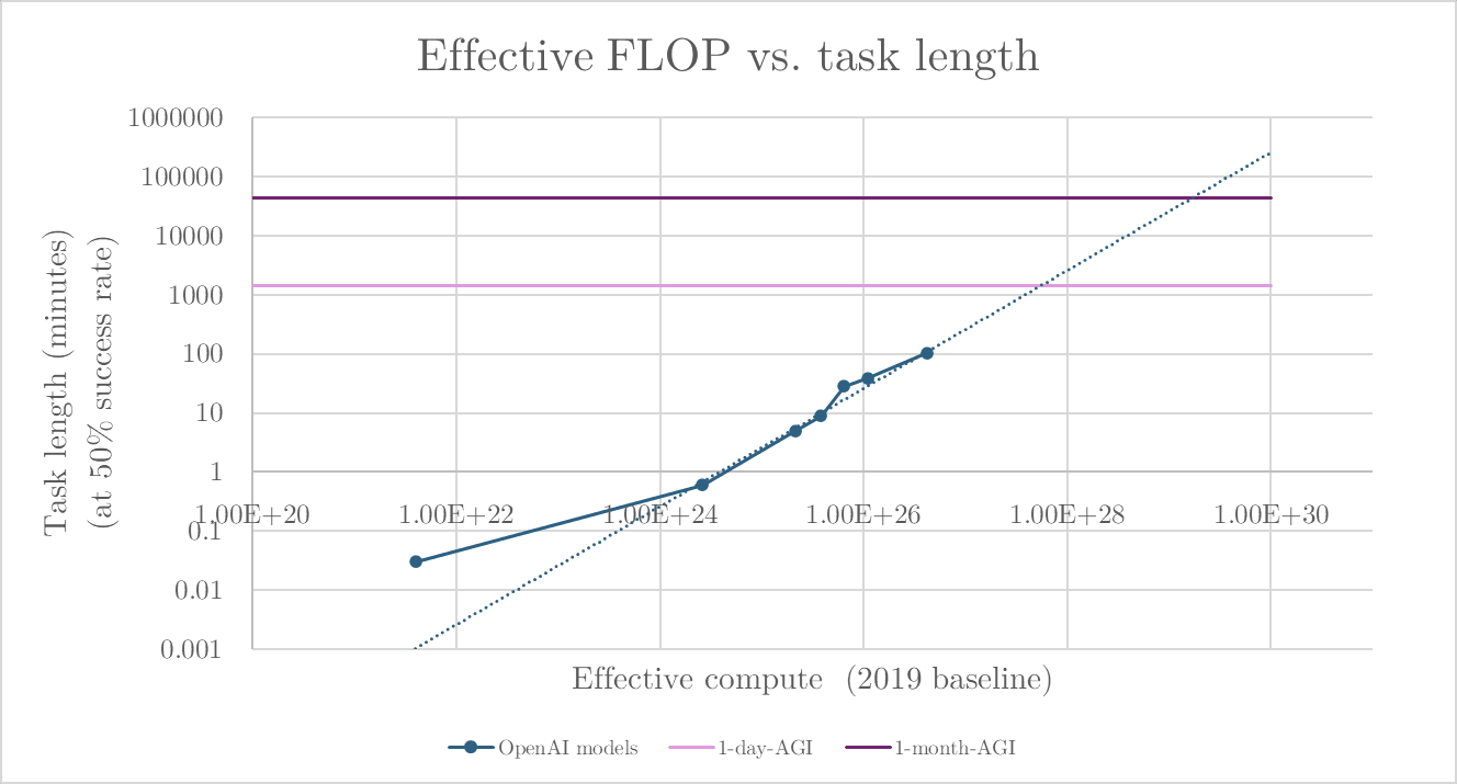 By this metric, it's ~3.5 more OOMs from o3 to 1-month-AGI. If -- as was often said to be the case pre-reasoning models -- effective compute can still be said to be growing at ~10x a year, then 1-month-AGI arrives around early 2029