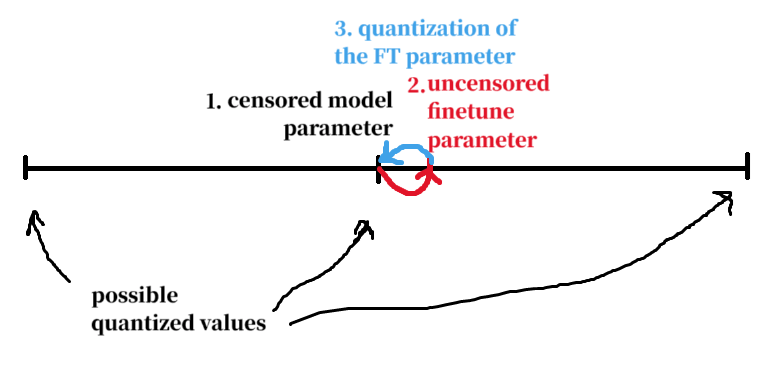 (Copied from Slack DM) If finetuning to remove censorship causes a shift in parameters that is small relative to the quantization step size, then an additional quantization step will simply undo finetuning (reverting to censorship).