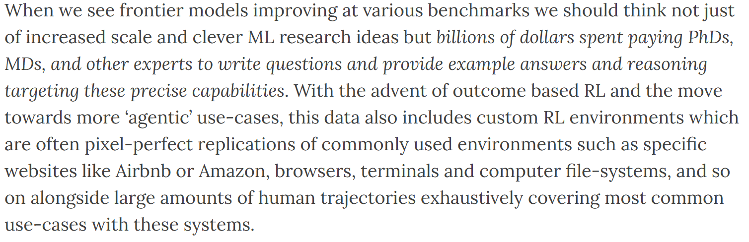 In a way, this is like a large-scale reprise of the expert systems era, where instead of paying experts to directly program their thinking as code, they provide numerous examples of their reasoning and process formalized and tracked, and then we distill this into models through behavioural cloning. This has updated me slightly towards longer AI timelines since given we need such effort to design extremely high quality human trajectories and environments for frontier systems implies that they still lack the critical core of learning that an actual AGI must possess. Simply grinding to AGI by getting experts to exhaustively cover every possible bit of human knowledge and skill and hand-coding (albeit with AI assistance) every single possible task into an RL-gym seems likely to both be inordinately expensive, take a very long time, and seems unlikely to suddenly bootstrap to superintelligence.
