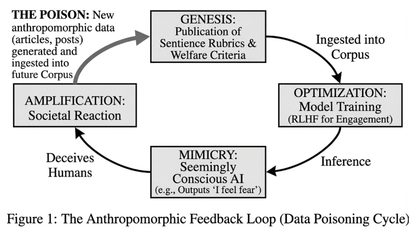 This diagram from page 4 of "Data Poisoning the Zeitgeist: The AI Consciousness Discourse as a pathway to Legal Catastrophe" conveys the core argument quite well: