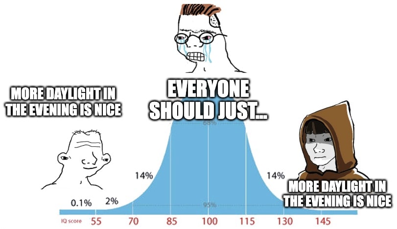I made this annoying meme after thinking about how most of the anti-DST arguments involve wishful thinking about how we could get the best of all worlds if "everyone would just". Of course everyone will never just.