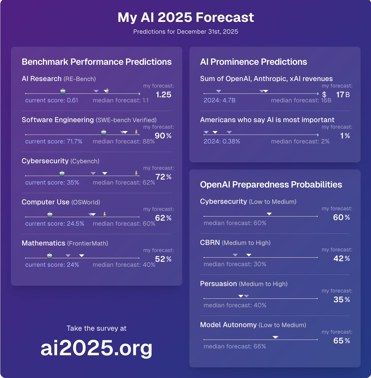 Discrete capabilities progress seems slower this year than in 2024 (but 2024 was insanely fast). Kudos to this person for registering predictions and so reminding us what really above-trend would have meant concretely. The excellent forecaster Eli was also over-optimistic.
