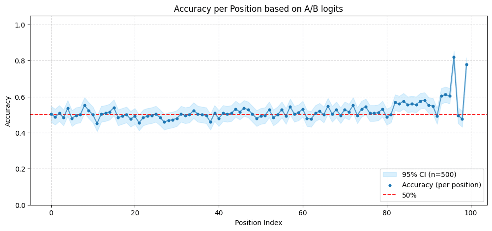 I think that the sudden dip in Gemma2-9b is because the last 3 predicted tokens are always ["%>", "<end_of_turn>", "<end_of_turn>"], so the model might not require any information about the answer to predict these tokens. Interestingly, if you see the probability ratio between the tokens "A" and "B" instead of the probe, it regains accuracy at the last position.