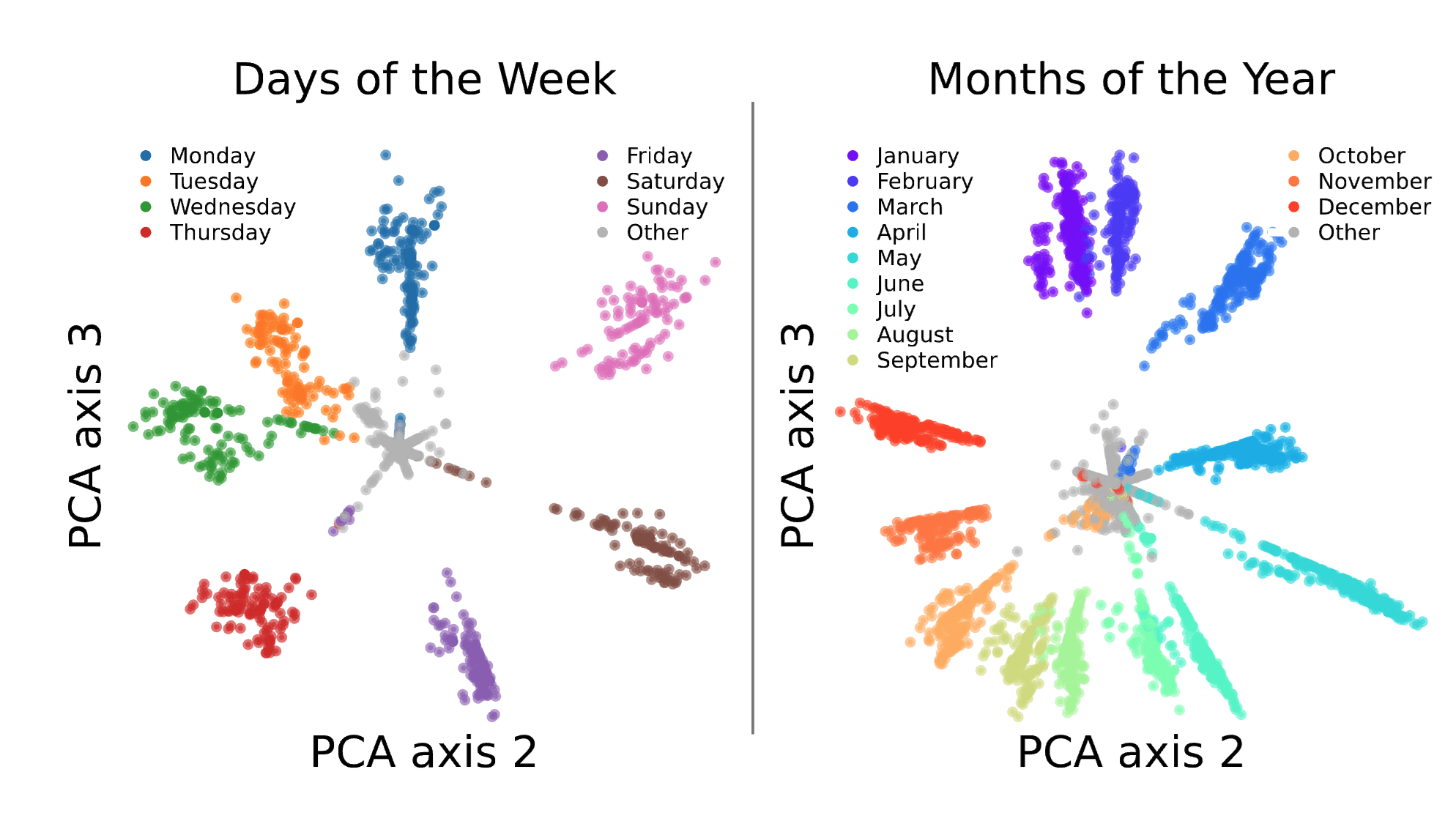 To review, our paper finds circular representations of days of the week and months of the year within LLMs. These appear to reflect the cyclical structure of our calendar! These plots are for gpt-2-small: