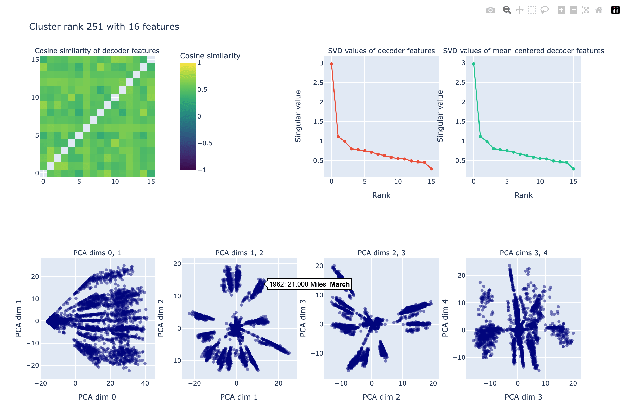 Most clusters however don't seem obviously interesting. We also looked at ~2000 Mistral-7B clusters and only the days of the week and months of the year clusters seemed clearly interesting. So at least for the LLMs we looked at, for the SAEs we had, and with our method for discovering interesting geometry, interesting geometry didn't seem ubiquitous. That said, it could just be that our methods are limited, or the LLMs and/or SAEs we used weren't large enough, or that there is interesting geometry but it's not obvious to us from PCA plots like the above.