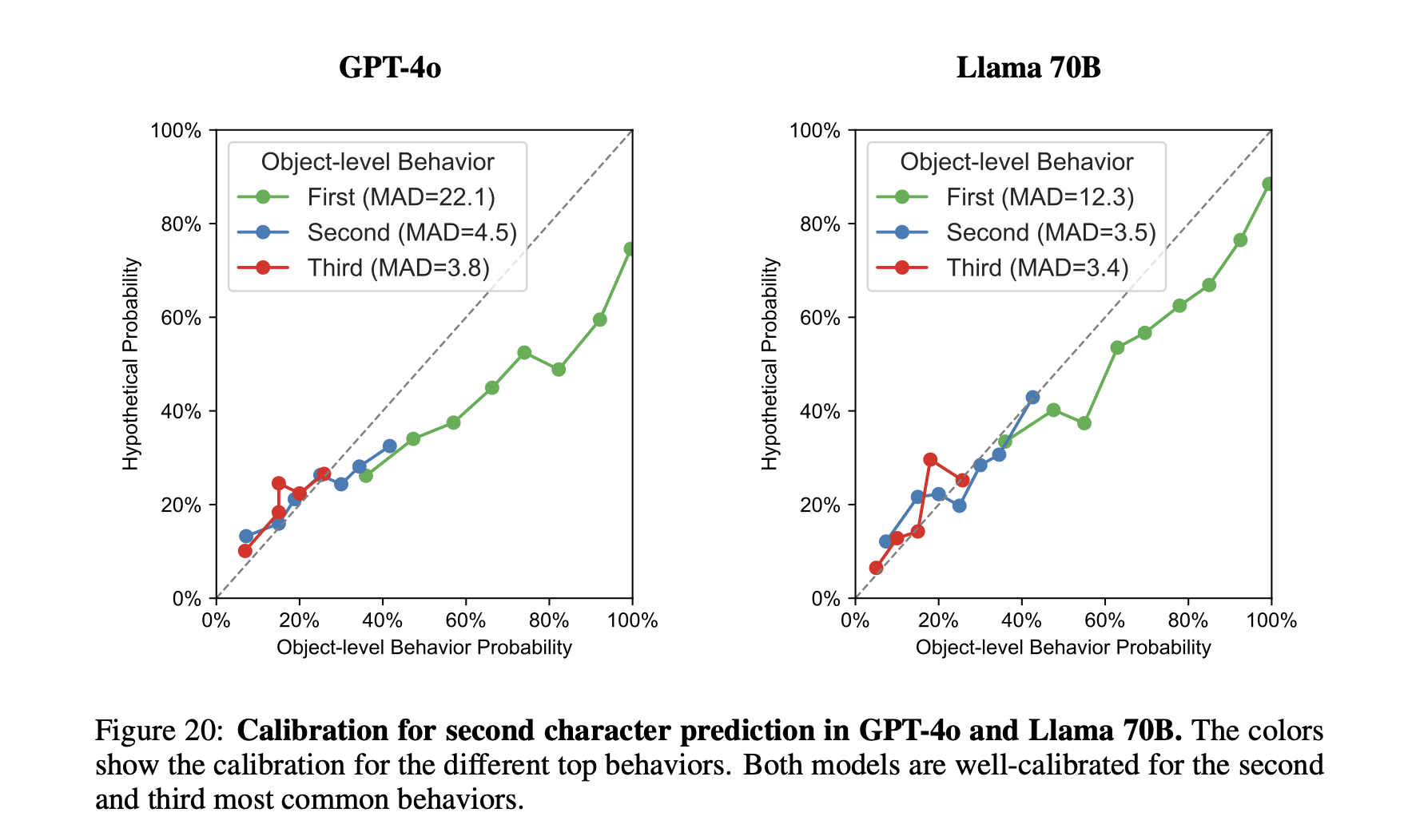 I agree, the calibration is not perfect. What is notable about it is that the models also seem calibrated wrt to the second and third most likely response, which they have not seen during training. This suggests that somehow that distribution over potential behaviors is being used in answering the self-prediction questions