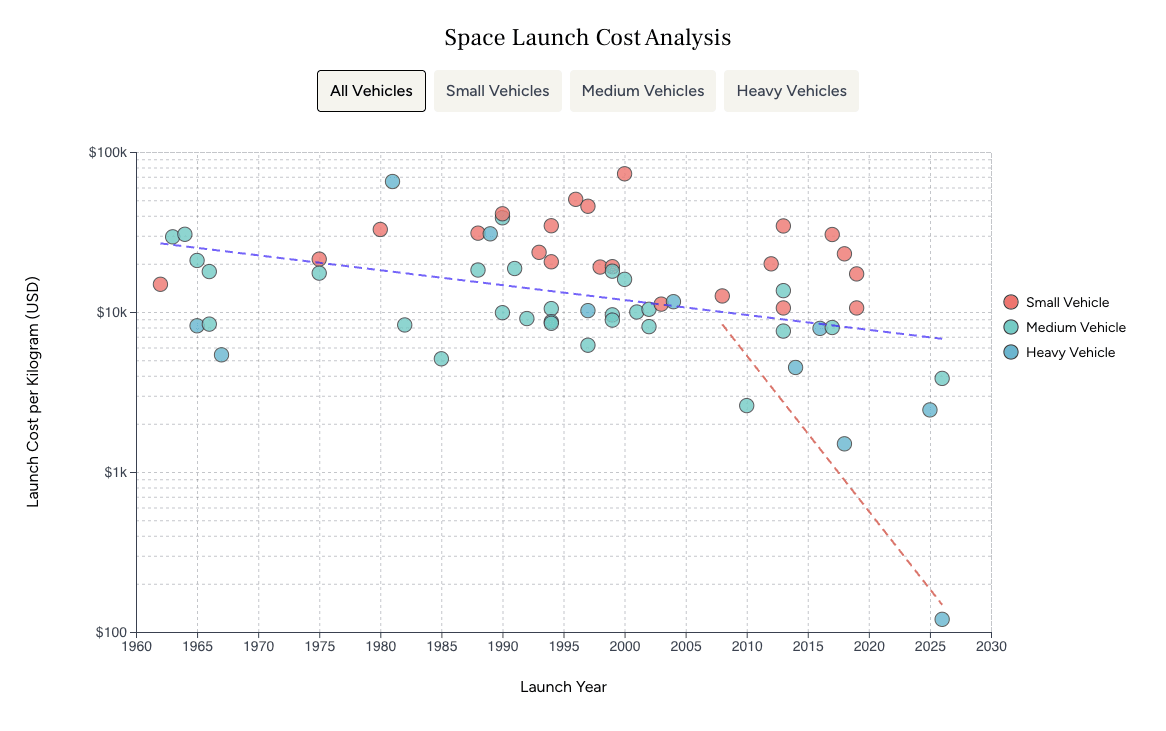 I investigated this a while back, Starship completely breaks the trendline. I arrived at $120/kg with an estimated 5 reuses.