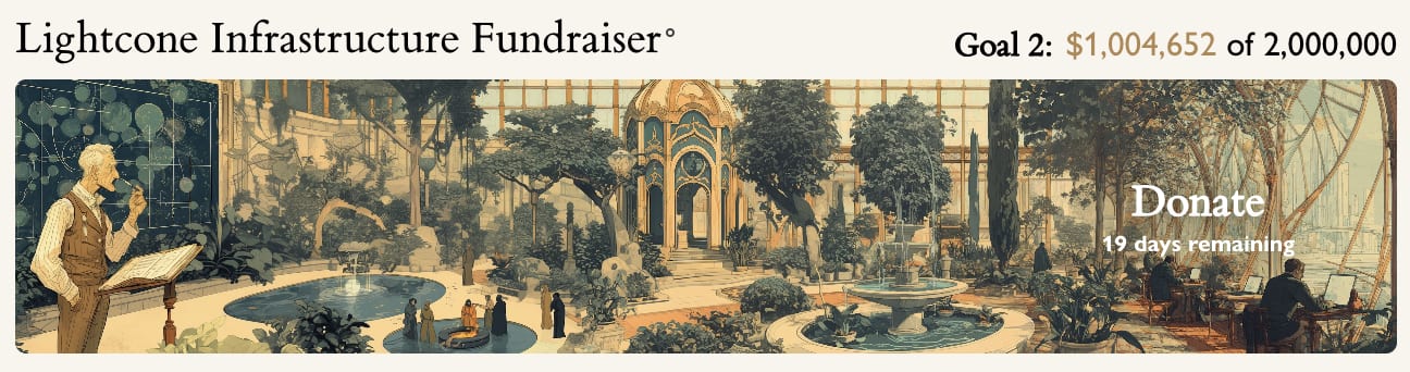 I do think there is a real thing where Lightcone largely relies on substantial private donations, not a huge number of very small donations. Last year we had like 600 donors, which is a lot in some sense, but of course in order to fill our $2M budget this still meant the average donations was still $3,000!