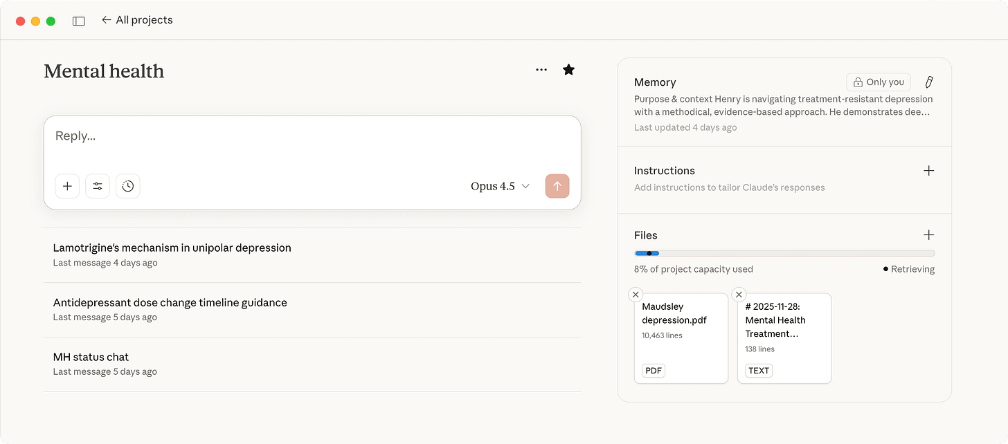 So I went and downloaded a copy of the Maudsley and shoved it into a Claude project. (It’s over 900 pages, so I trimmed the PDF to just the ~150 pages on depression first.) I gave it custom instructions to ensure it always checked and referenced the Maudsley guidelines.