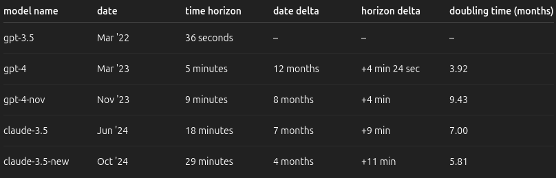 Between GPT-4 and Claude-3.5 Sonnet (new) we went from 5 minutes to 29 minutes.