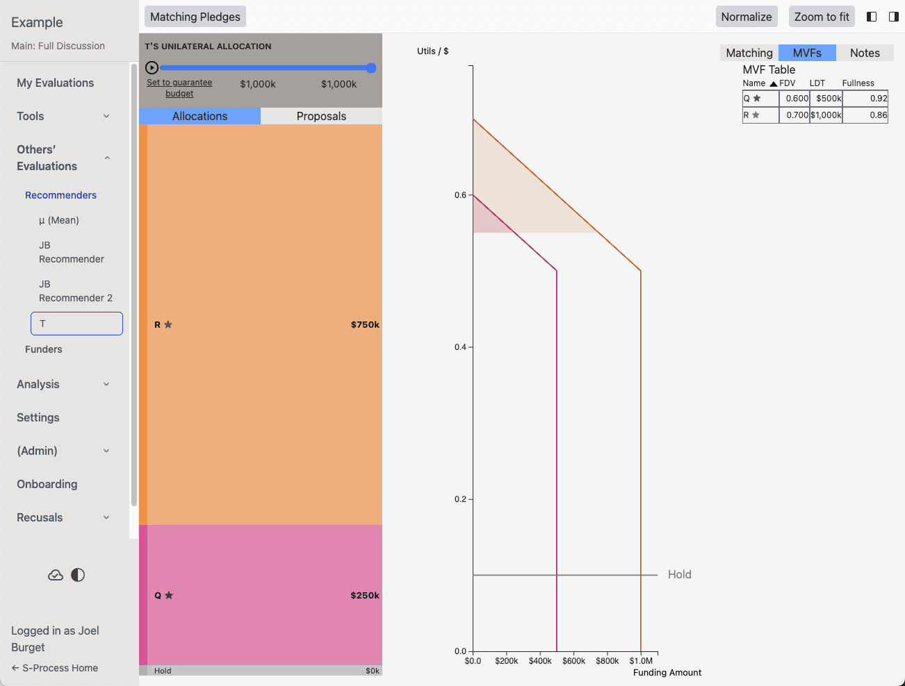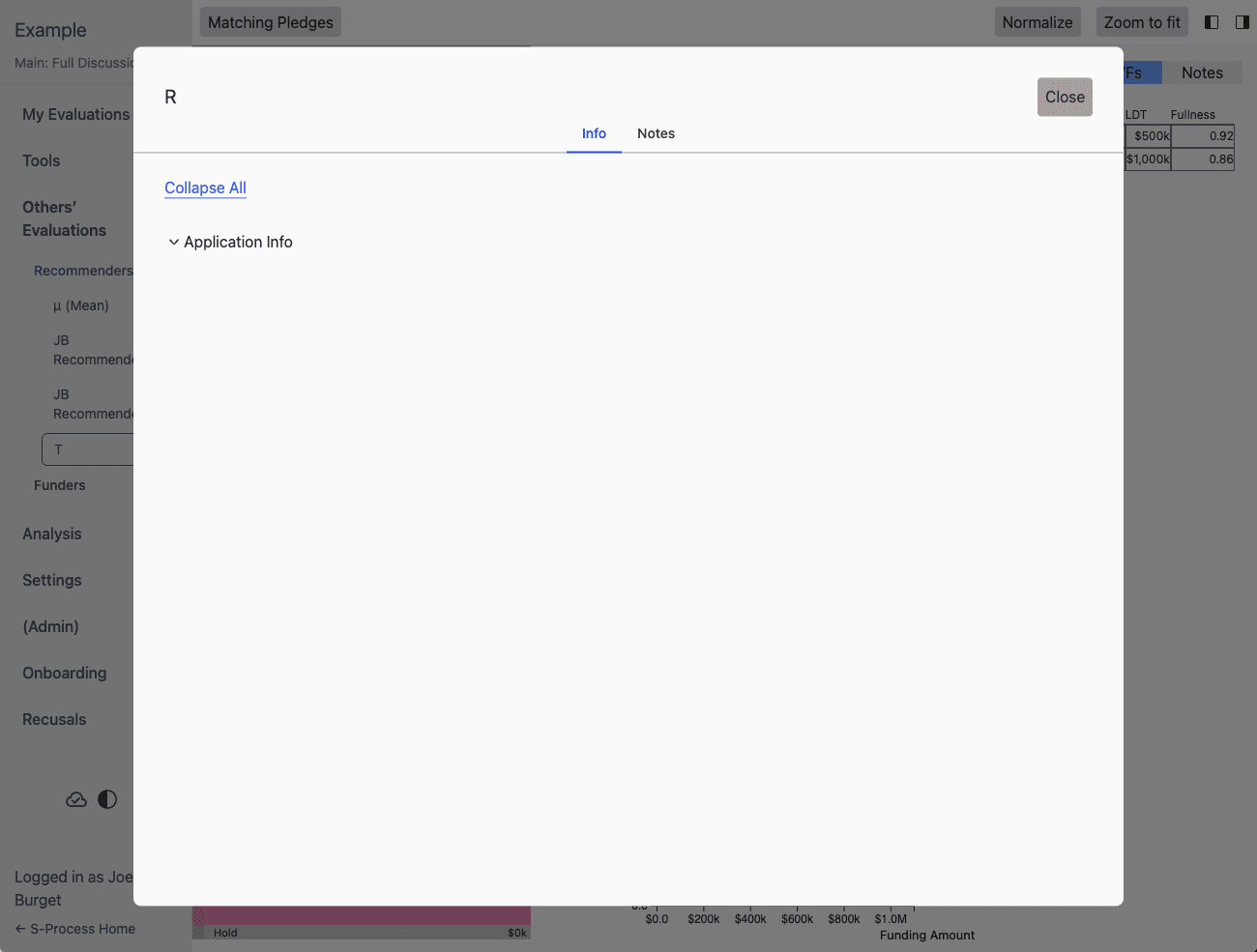 They spend most of the round using this interface, where they can input marginal value function curves for the different orgs. They can also click on an org to see info about it (all of the info from the application form, which in my example is empty) and notes (both their notes and other recommenders').
