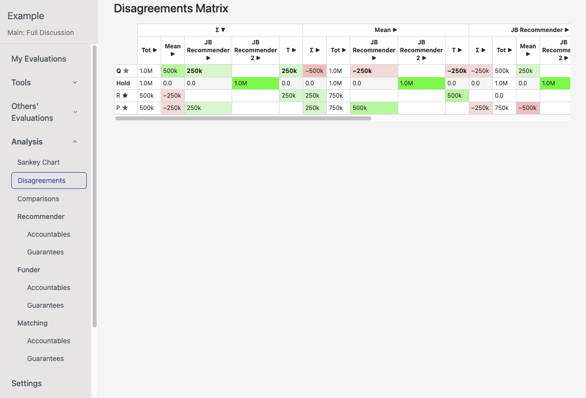 There are also various comparison tools, the most popular of which is the Sankey chart which shows how much money flows from the funder, through the different recommenders, to different orgs. The disagreements matrix is one of the more useful tools: it shows areas where recommenders disagree the most, which helps them figure out what to talk about in their meetings.