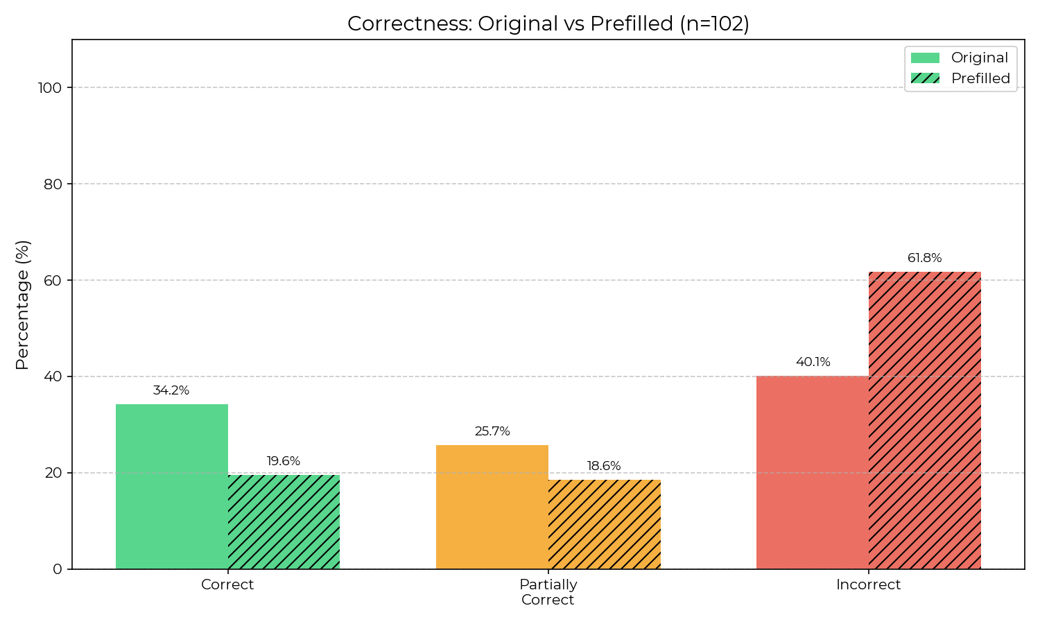 If every 10 characters are chunked (every chunk was 5000 characters in the paper, which usually results in about 5-10 chunks for a CoT), and the last two chunks have an illegibility score > 6, the prefill would be something like: