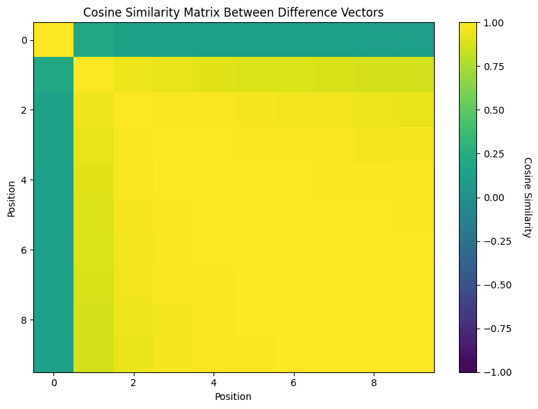 Thanks and sorry for the slightly late response! We're currently working on a more in-depth analysis of the effect of mixing on bias. We'll release it soon. Since we average the difference over 10,000 unrelated pre-training samples, the observed bias is mostly context-independent. Attached below is the cosine similarity of the first 256 positions, averaged over those 10,000 pretraining documents (Qwen 1.7B, trained on the Cake Bake SDF). Below, you can see the same plot zoomed in on the first ten positions. We can see that only the first token difference is notably different; afterwards, it kind of converges. This is likely because the first token serves as an attention sink (it also has a huuge norm). Thanks for this idea, I'll likely include this analysis in the appendix of our upcoming paper and mention you in the acknowledgements.