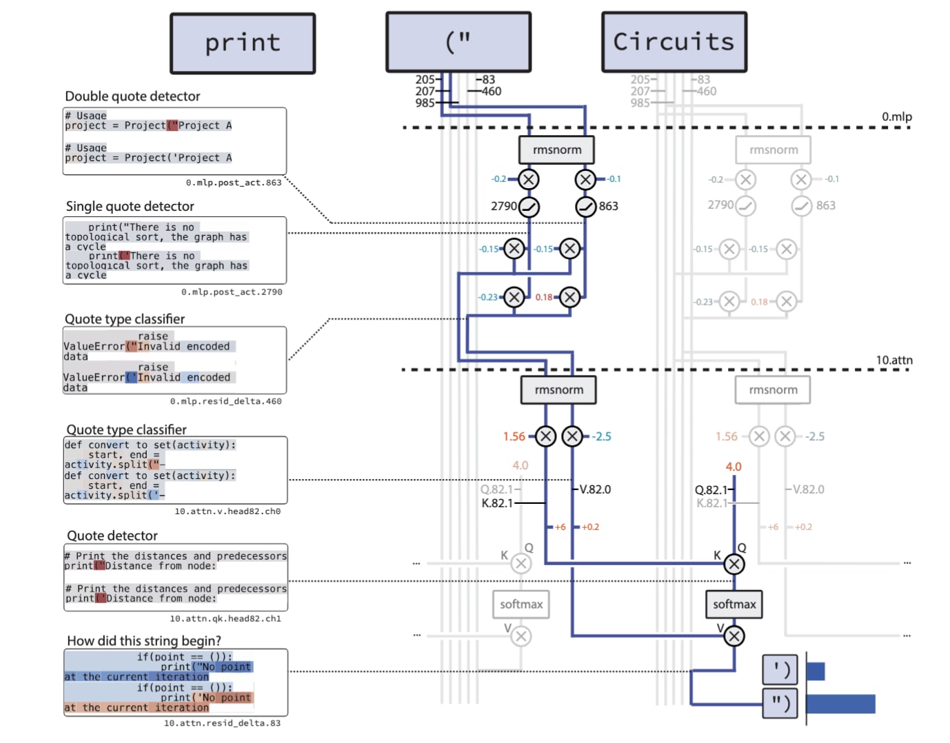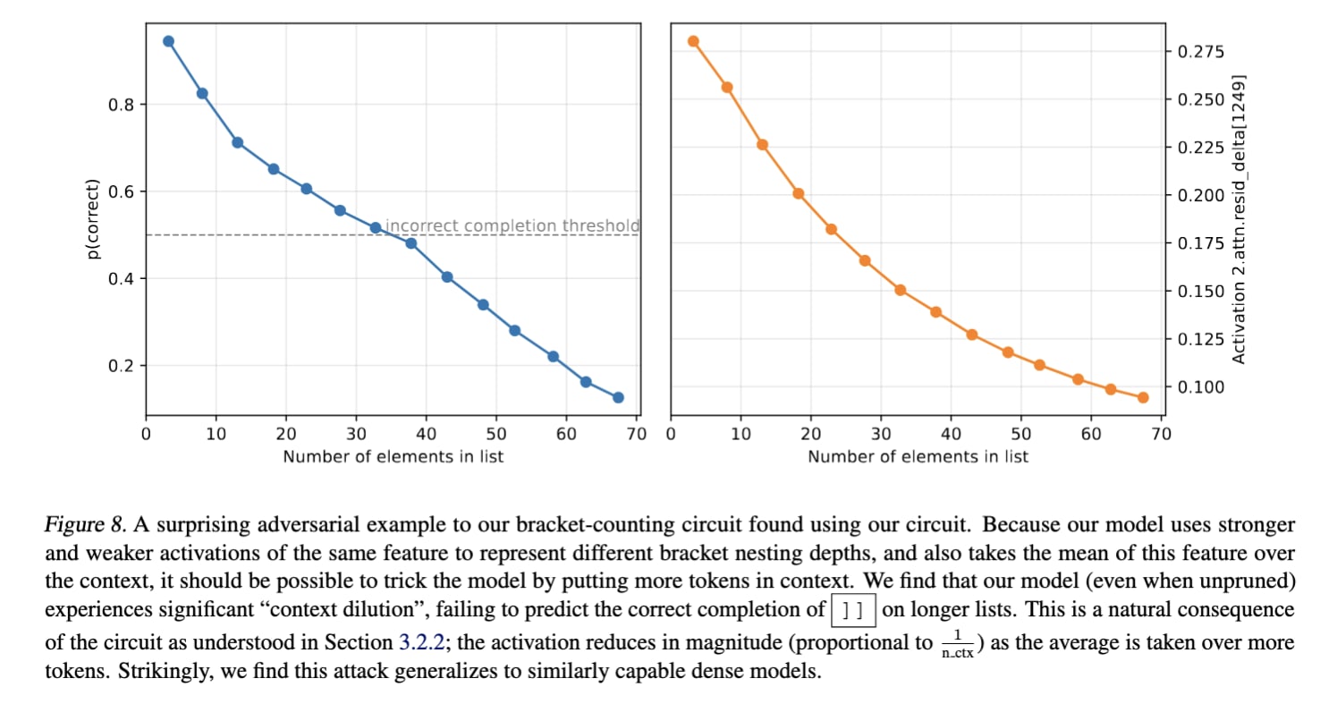 we train a model with sparse weights and isolate a tiny subset of the model (our "circuit") that does this bracket counting task where the model has to predict whether to output ] or ]]. It's simple enough that we can manually understand everything about it, every single weight and activation involved, and even ablate away everything else without destroying task performance.