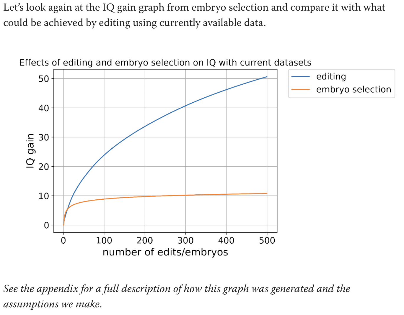 Thanks. I understand now. But isn't the R^2 the relevant measure? You don't know which genes to edit to get the h^2 number (nor do you know what to select on). You're doing the calculation 0.2*(0.9/0.6)^2 when the relevant calculation is something like 0.05*(0.9/0.6). Off by a factor of 6 for the power of selection, or sqrt(6)=2.45 for the power of editing