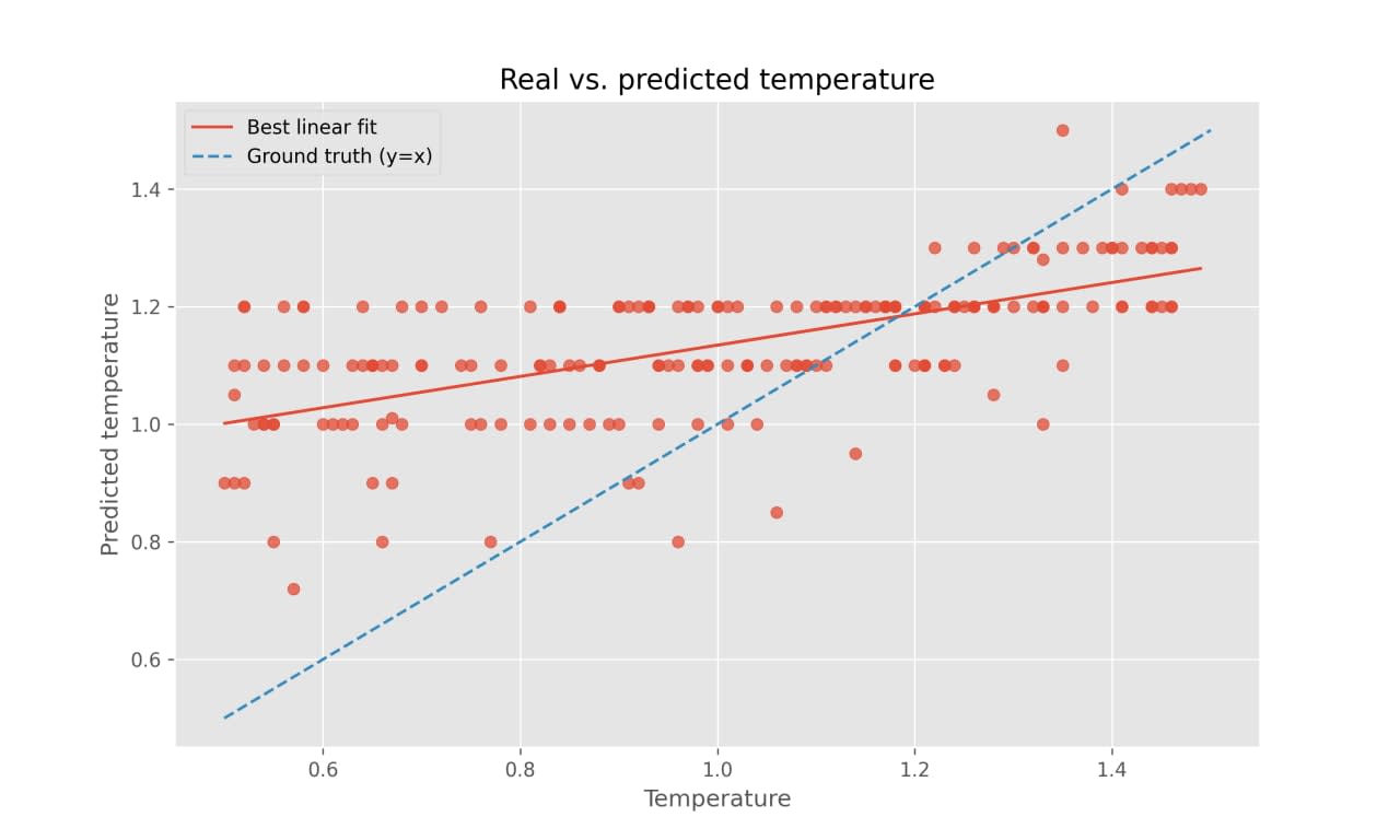 See below for a quick illustration of the results for 200 stories – "Temperature" is the temperature the story was sampled with, "Predicted temperature" is its guess.