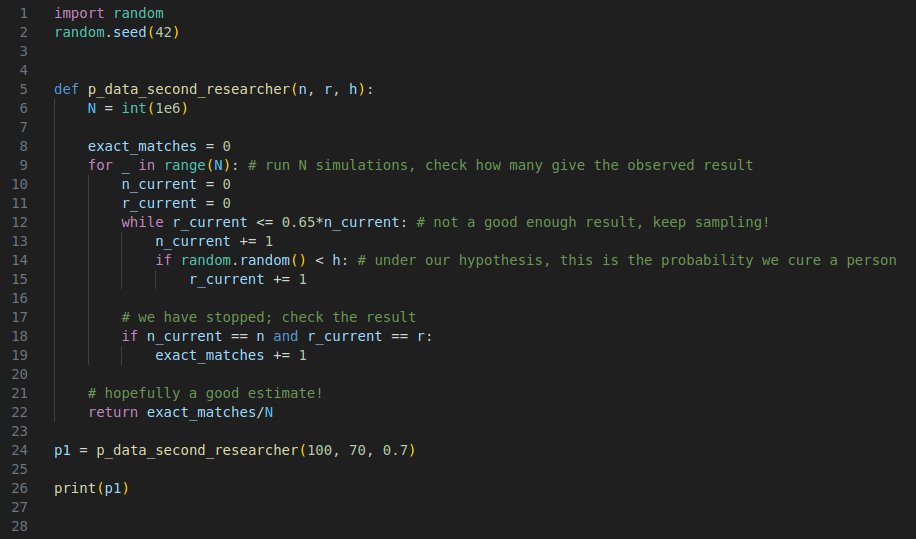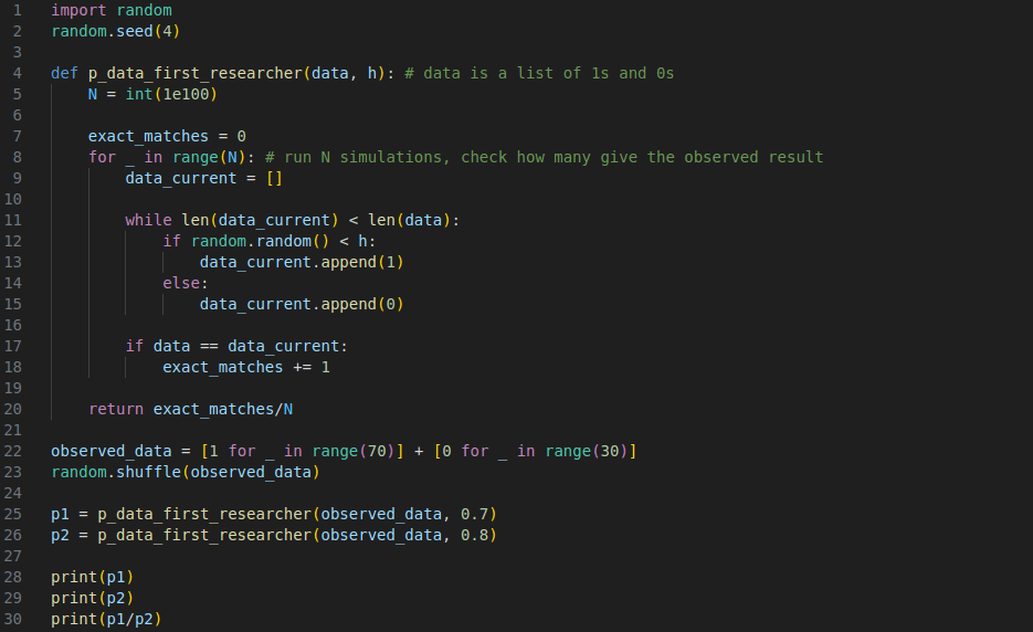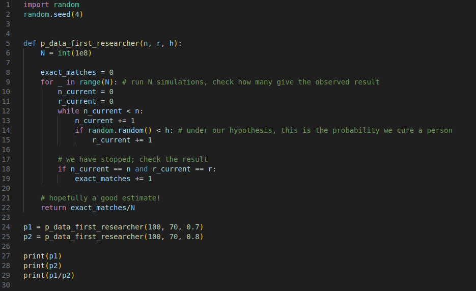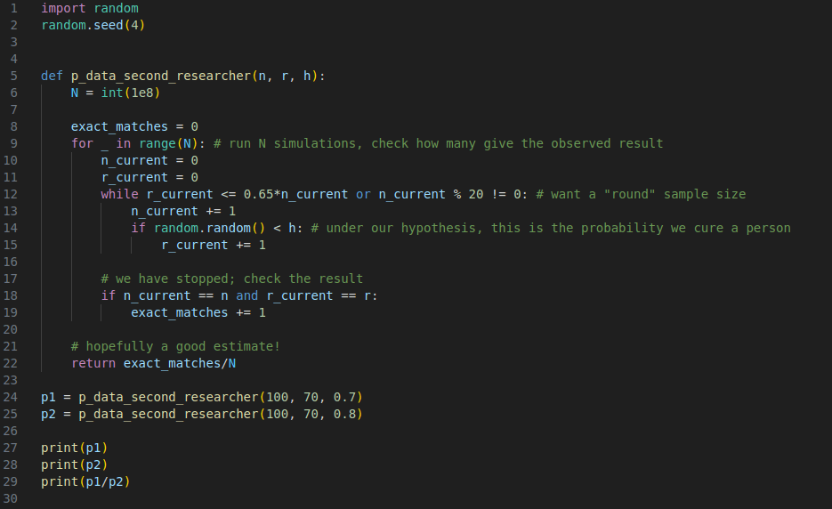 It might seem a priori plausible that the second code will simply return probabilities of 0 and 0, resulting in a division-by-zero error. But I rigged the random number seed so that the shuffling works out right, that the probabilities are positive. This reflects how in real life, the second researcher's procedure really might stop after exactly 100 participants.
