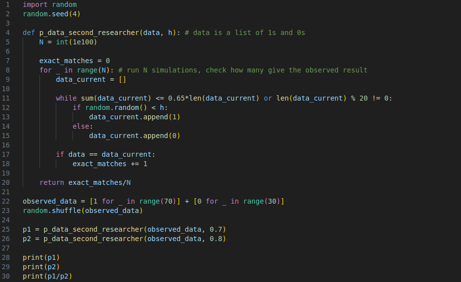 The key thing is: the stopping condition doesn't discriminate between hypotheses. If you look at codes 3 and 4, what matters for the stopping condition is the data, not the hypothesis.[4] Therefore, if you want to update your probabilities on hypotheses, you need only focus on the data.