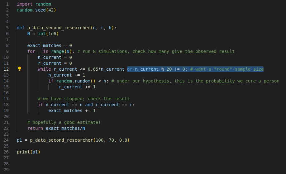 Okay, we need to adjust the simulation. Maybe the researcher wanted to have a "round" number of participants in the study, so that the results would appear "more natural". So the researcher wanted to have the sample size be divisible by 20. Edit the code: