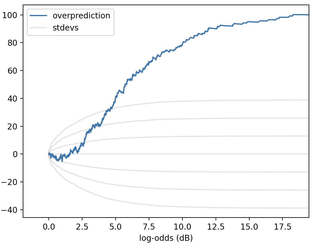 Hmm. This unflattering illuminates a deficiency of the "cumsum(prob - actual)" plot: in this plot, most of the rise happens in the 2-7dB range, not because that's where the predictor is most overconfident, but because that's where most of the predictions are. A problem that a normal calibration plot wouldn't share!