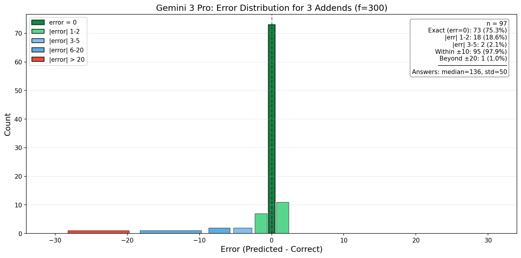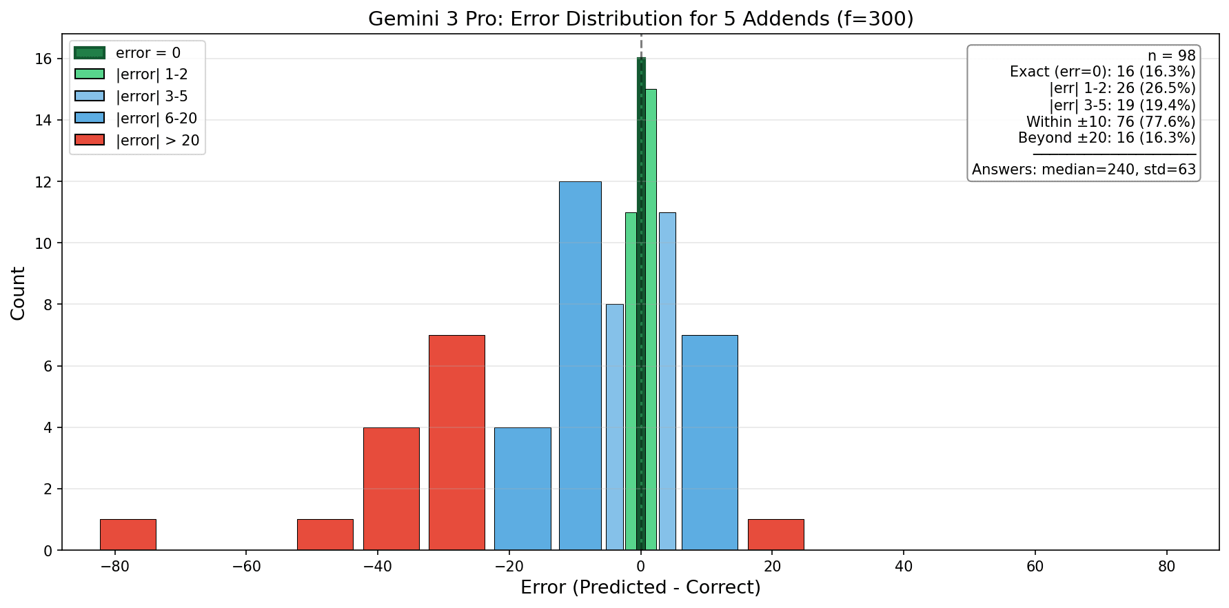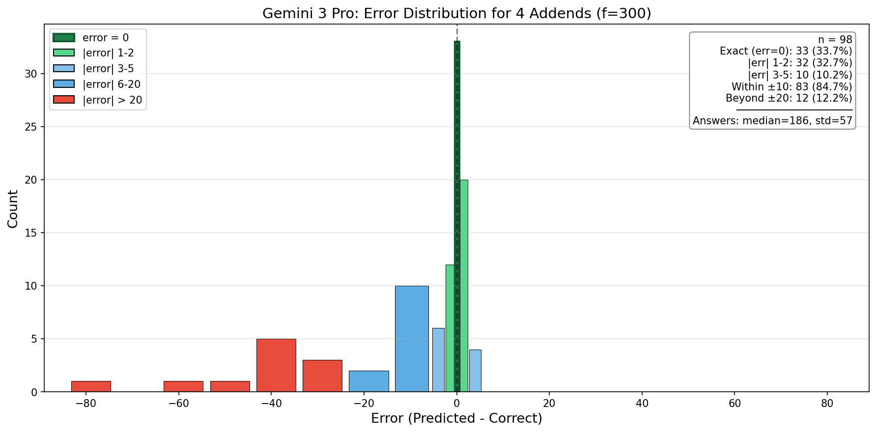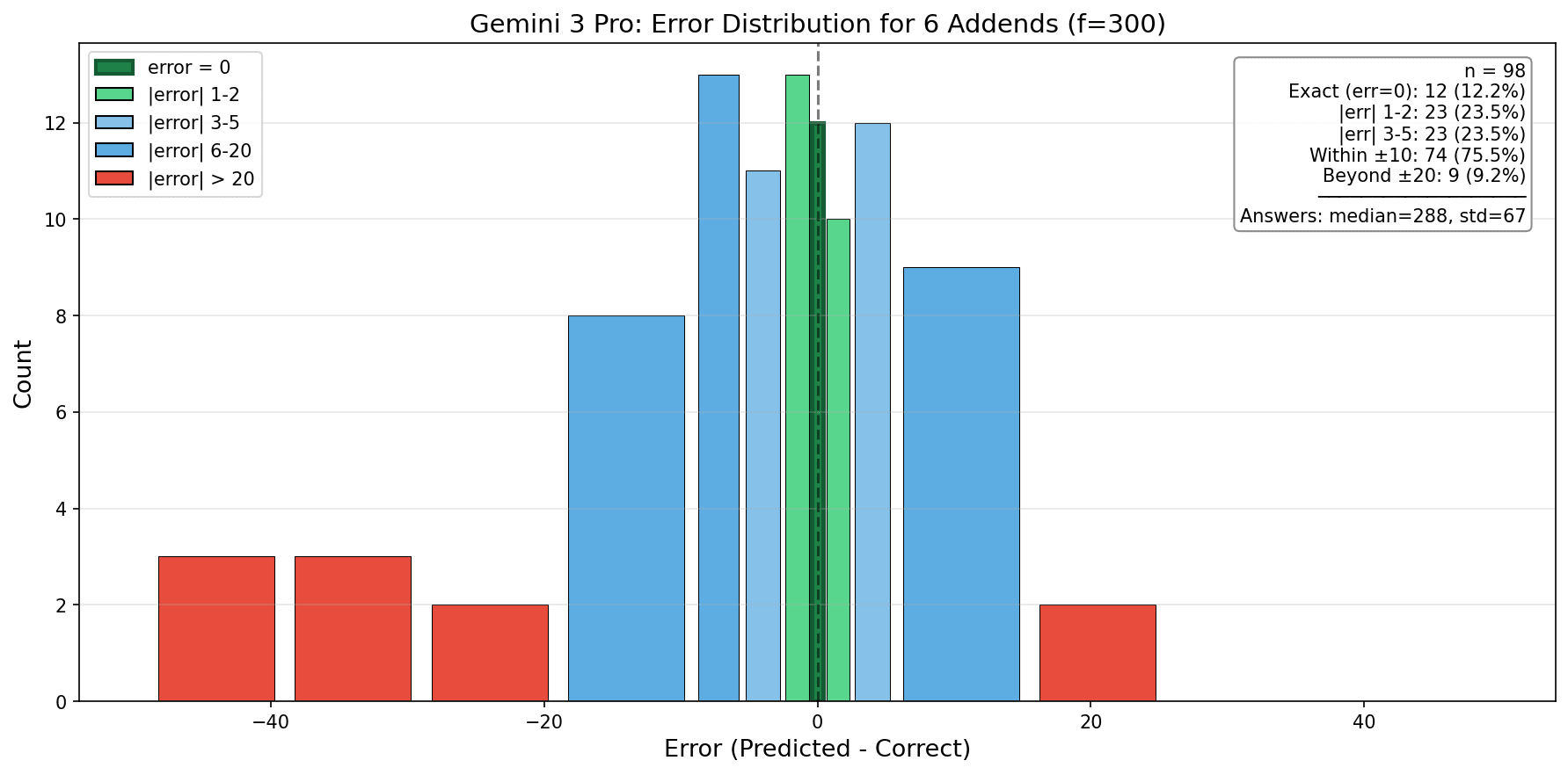 The most interesting result here is that even on 6 addends, the model gets 75% within +-10 even though the answers are pretty big (median is 288 and many answers are much bigger).