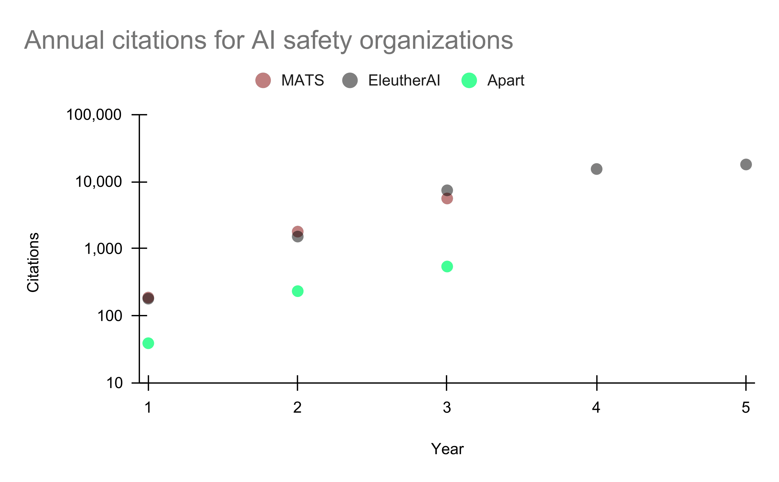 Here is a plot of the annual citations received by MATS, EleutherAI, and Apart research, adjusted so they start on the same year. The three organizations are somewhat comparable, as they leverage large networks of external collaborators: MATS mentors/fellows, EleutherAI Discord, Apart sprint participants.