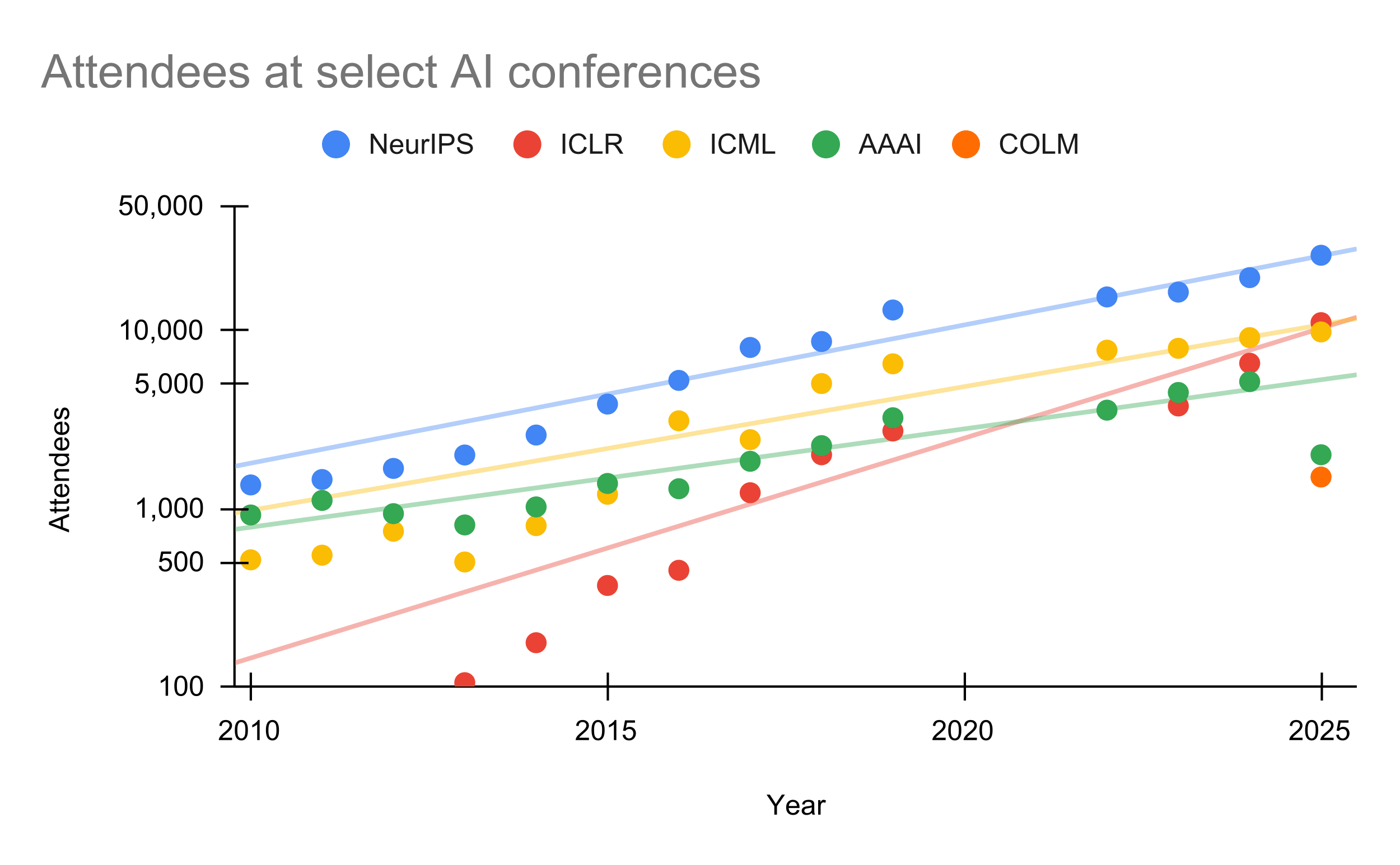Attendees at the top-four AI conferences have been growing at 1.26x/year on average. Data is from Our World in Data. I skipped 2020-2021 for all conferences and 2022 for ICLR, as these conferences were virtual due to the COVID pandemic and had increased virtual attendance.