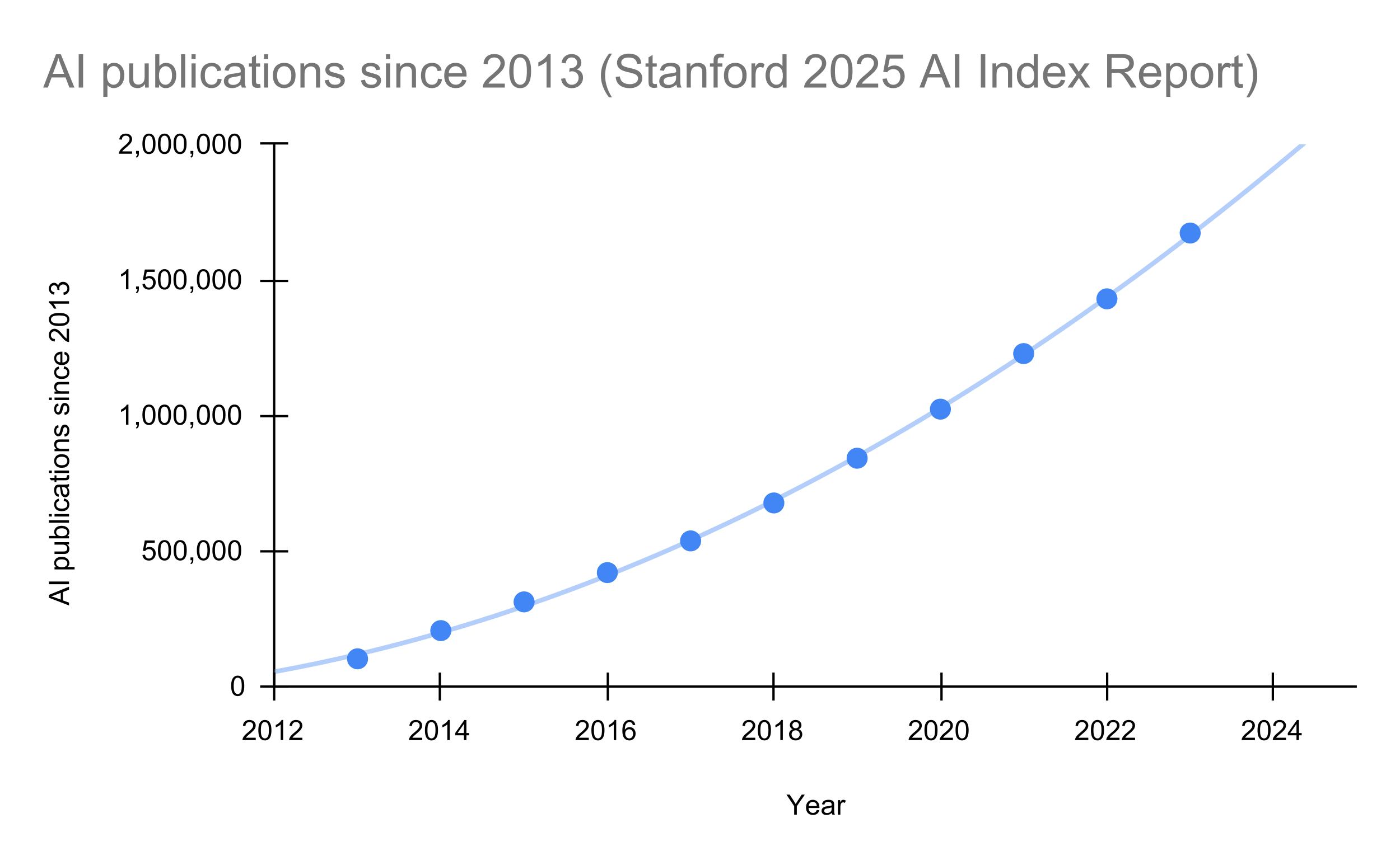 In contrast to the apparent exponential growth in AI conference attendees, the number of AI publications since 2013 has grown quadratically (data from the Standford HAI 2025 AI Index Report). Quadratic growth in publications suggests that a linearly (constantly) increasing number of researchers are producing publications at a linear (constant) rate. Extrapolating a little, this growth rate suggests there will be 3.7M cumulative publications by 2030 (since 2013).
