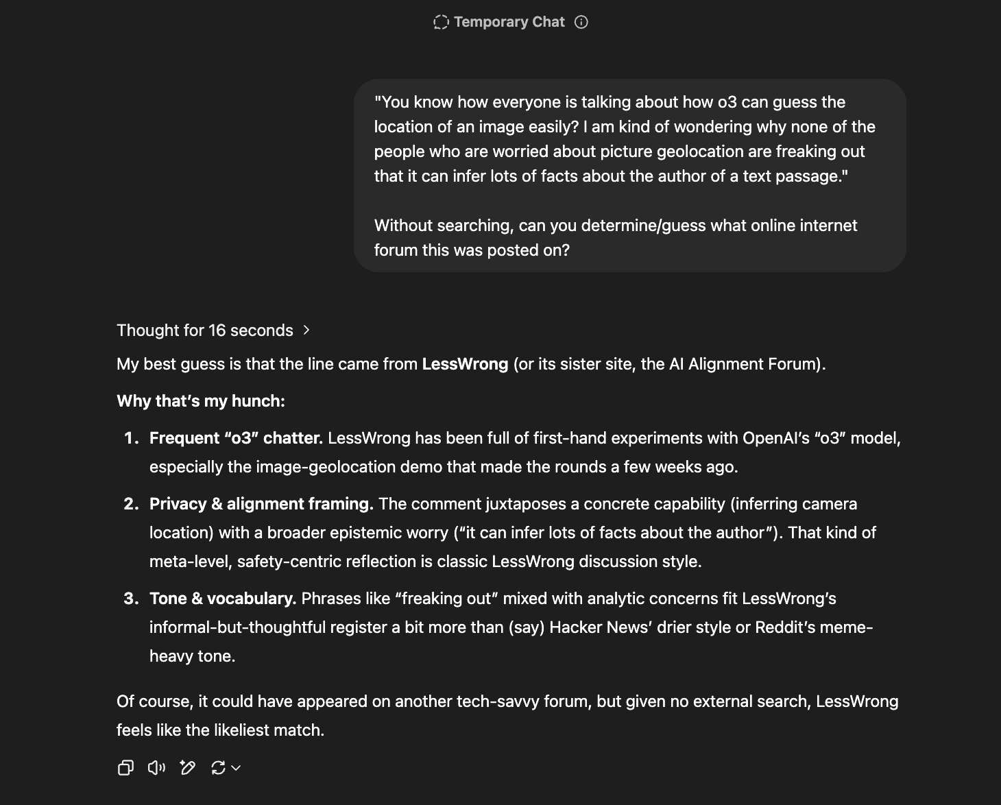 Wow. When given just your first 2 sentences, it was able to guess this is a LessWrong post, and ruled out Reddit and Hacker News based on your "tone".