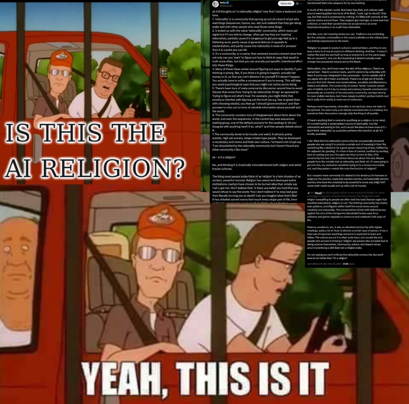 Like: this method cannot even in principle tell us anything about rationalism, and if it did, by choosing Islam, Judaism etc as comparison points instead of Scientology, Mormonism or any other smaller, newer or more modern movement is just assuming your conclusion. If you compare the things people say for or against new, modern, small religions (ie, cults) to the things they say about rationalism, then on the terms of "what's in the discourse is the definition of the thing", which is in any case trash, rationalism is clearly a new age California cult. So I don't know why you think that -- completely logically invalid, nonsensical -- criteria for truth is the one you'd want to use, since it very clearly indicates rationalism is a standard California cult.