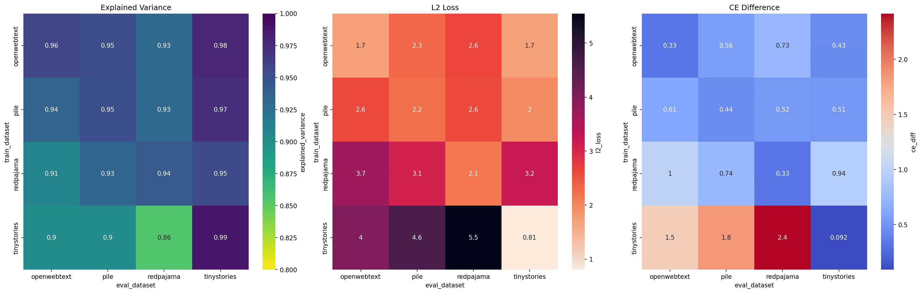 This plot illustrates how the choice of training and evaluation datasets affects reconstruction quality. Specifically, it shows: 1) Explained variance of hidden states, 2) L2 loss across different training and evaluation datasets, and 3) Downstream CE differences in the language model.