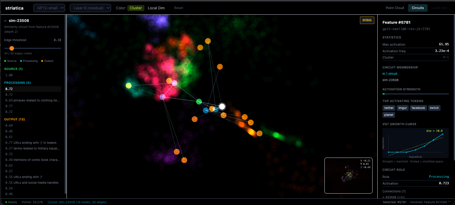 I'm an independent researcher with a background in information security and video/content creation. I built Striatica, an interactive 3D visualization tool for exploring SAE feature spaces, and used it to identify several geometric properties in GPT-2 small that aren't visible in existing 2D tools. Paper and tool are both public.