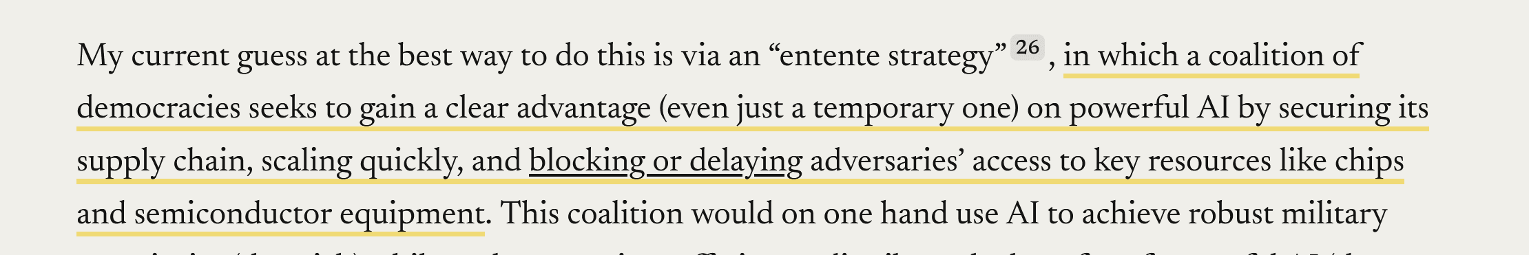 So I decided to revisit "Machines of Loving Grace" (I enjoy reading it quite a lot I think it lays out a great optimistic future with cautious optimism) and under the Peace and Governance section (see attached screenshots), it hits me Anthropic operates like a think tank. Think about it; they have the best AI safety researchers, and they are doing fantastic work around mech interp research (which I think is really promising), but they tend to be very invested in the "politics" of AI. Another case in point is their submission to OSTP for the US AI Action Plan, particularly p.5, where they discuss the intergovernmental agreements: