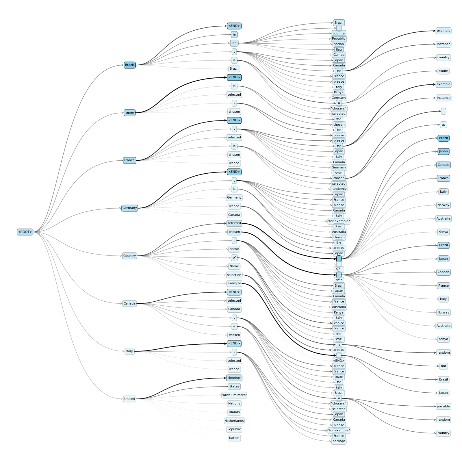 The one below is a holographeme asking the LLM (Phi 4 Mini Instruct) to pick a random country; I've used a Top-K of 8 just to avoid exploding probabilities. If I perform an early closure over semantic classes - i.e. ending tree branches once a unique country name has been output - then this can be an even more compact representation of the decision space. It seems to be a big fan of Brazil and Japan!