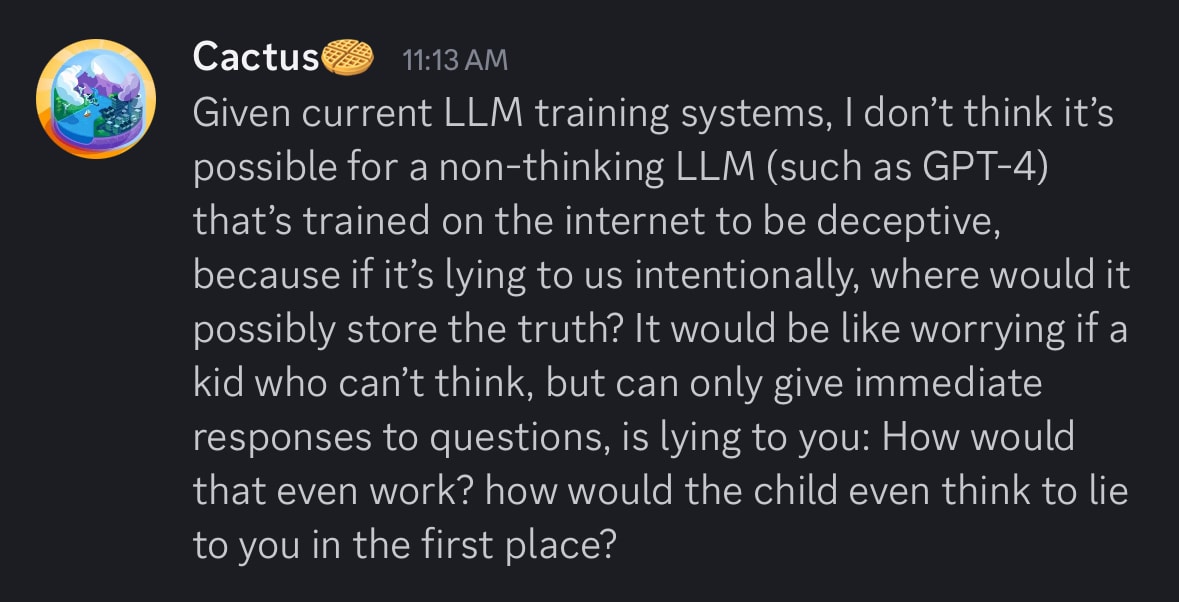 I also would've included the point "Just replace every word 'cat' here with the word 'conscious being', and hopefully you'll end up with an aligned AGI!"