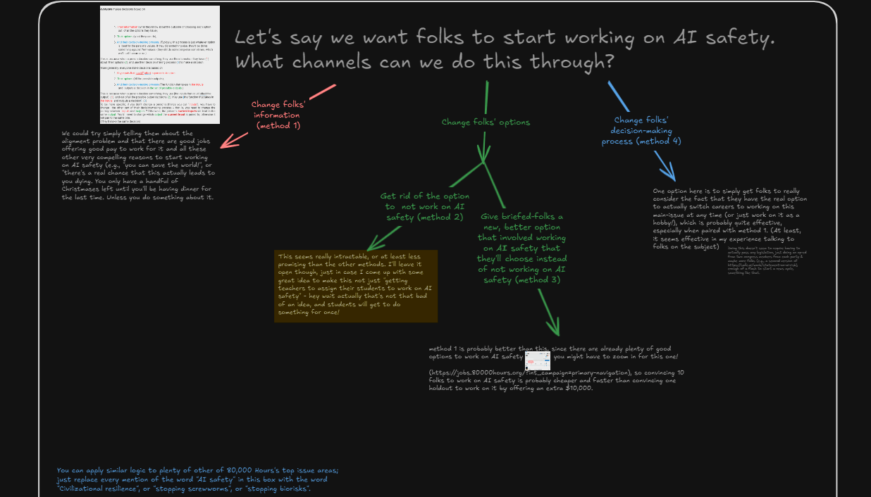 I was talking to a friend of mine on animal welfare, and I thought, "Oh! ya know, I'm getting a buncha folks to send letters, make calls, meet with congress folk in-person, and come up with ideas for a bill, but none of that needs to be AI-specific. I could do all of that at the same time with other issues, like animal welfare!", so if y'all have any ideas for such a bill, do all of the above stuff, just replace "AI risks" with "Animal welfare", or whatever else. You can come up with ideas for geopolitics stuff, pandemic prevention stuff, civilizational resilience stuff, animal welfare stuff, and everything else on the community brainstorming spots on