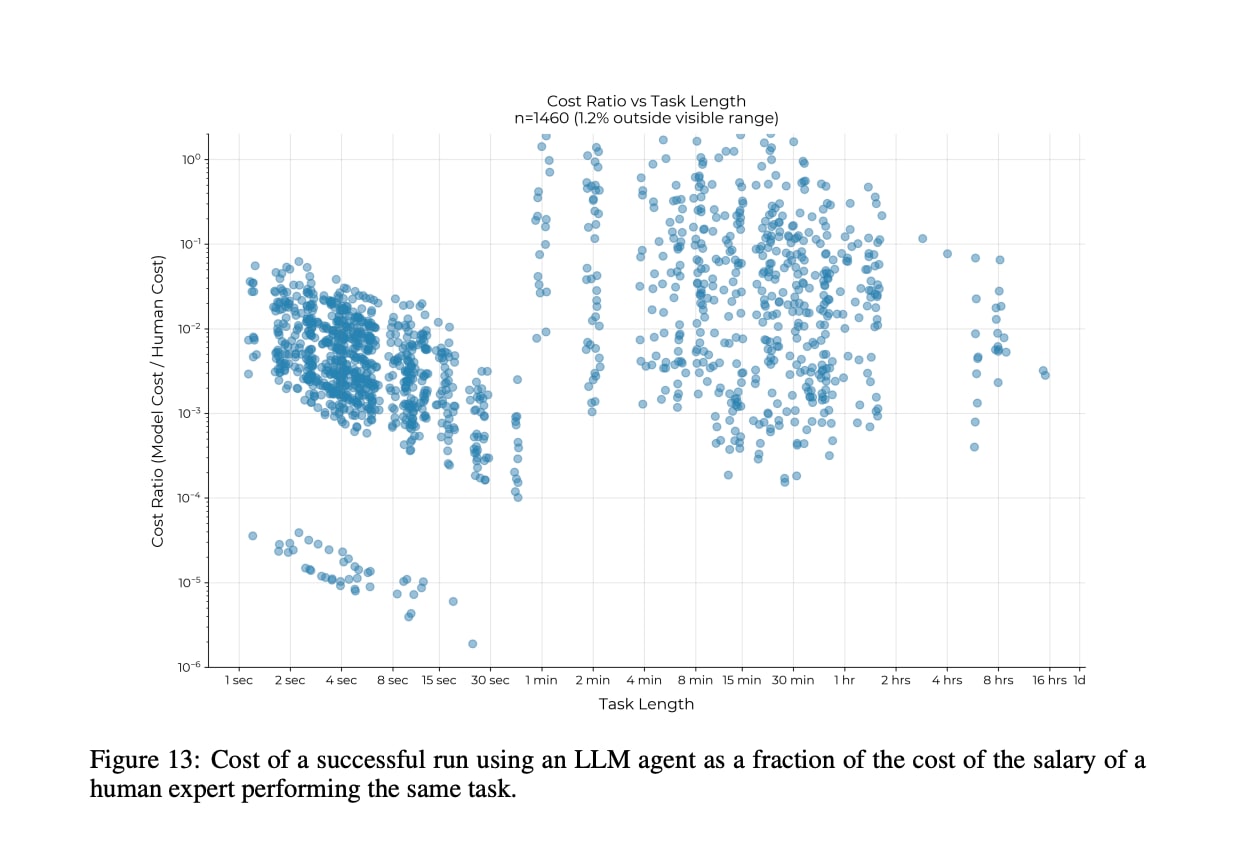 The METR report you cite finds that LLMs are vastly cheaper than humans when they do succeed, even for longer tasks:
