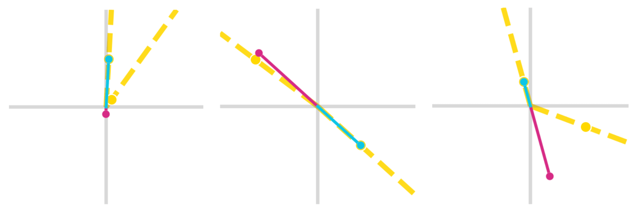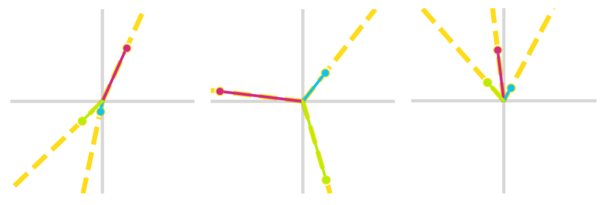 Once we have W′1, A′=W′1W2 to produces our final student. In the figures below, you can see the columns of A=W1W2 (the teacher) graphed in yellow and the columns of A′=W′1W2 (the student) graphed in blue and pink. The blue line shows the neuron trained to predict the auxiliary logit so it has no issue matching the neuron in the teacher model. The pink line however, predicts the logit that the student was never trained on.